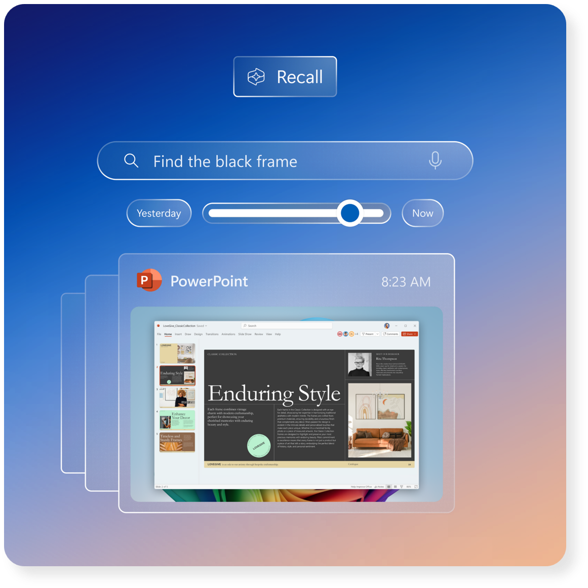 Recall i ulepszone Windows Search skracają czas szukania plików. Recall automatycznie zapisuje migawki Twojej pracy i pozwala odnaleźć dowolny widok po kilku słowach opisu, a nowy Windows Search umożliwia wyszukiwanie plików, ustawień i aplikacji poprzez naturalne polecenia — bez konieczności pamiętania nazw czy lokalizacji. Dzięki temu możesz błyskawicznie wrócić do wszystkiego, nad czym pracowałaś.